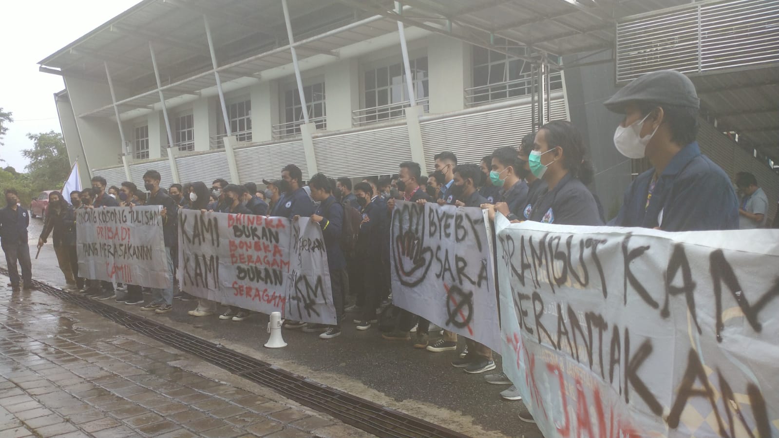 Puluhan Mahasiswa Institut Teknologi Kalimantan (ITK) menggelar aksi unjuk rasa damai di depan Gedung A Kampus ITK pada Senin (9/5/2022).