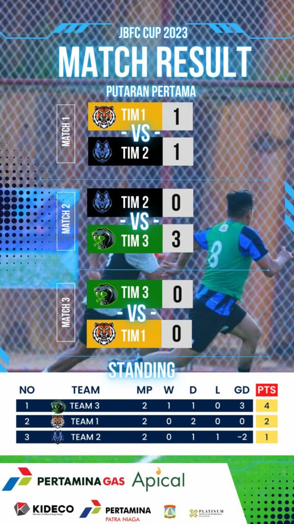 Hasilnya TIM 3 sementara unggul dengan torehan 4 poin dengan hasil ; TIM3 vs TM 1 bermain imbang 0-0 sedangkan TIM 3 vs TM 2 berakhir 3-0 untuk kemenangan telak TIM 3 yang dipunggawahi Rendi Lele.