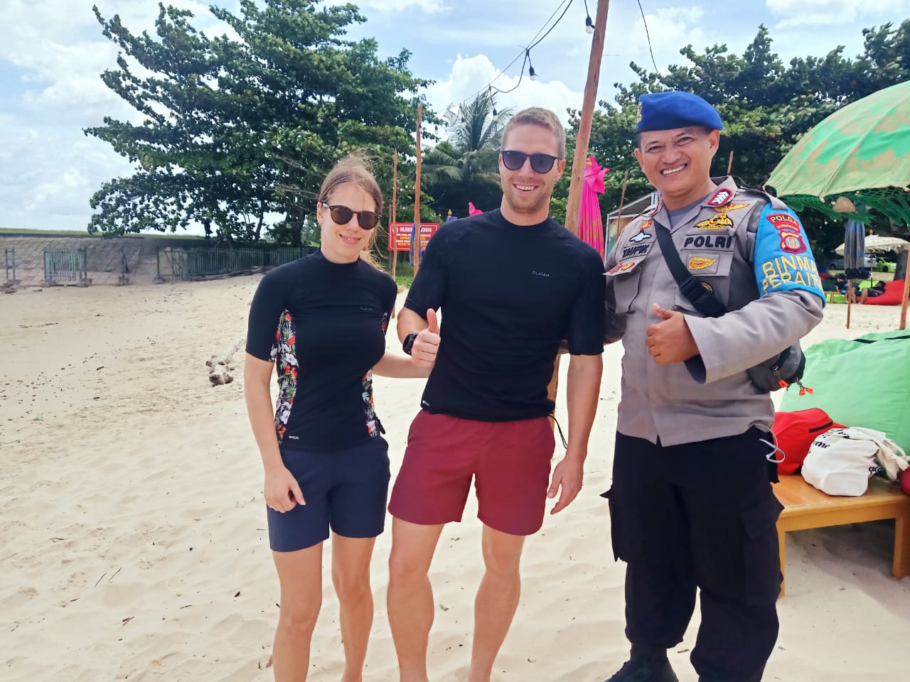 Bripka Taufik Ismail menyampaikan informasi penting terkait kondisi cuaca yang kurang bersahabat. Para pengunjung diingatkan agar tidak berenang atau mandi terlalu jauh dari Pantai