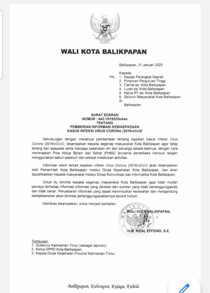 Surat itu bernomor 443./0192/Dinkes tentang pemberian informasi kewaspadaan kasus infeksi virus corona yang ditandatangani Wali Kota Balikpapan Rizal Effendi. Surat tersebut diterbitkan pada 31 Januari 2020.
