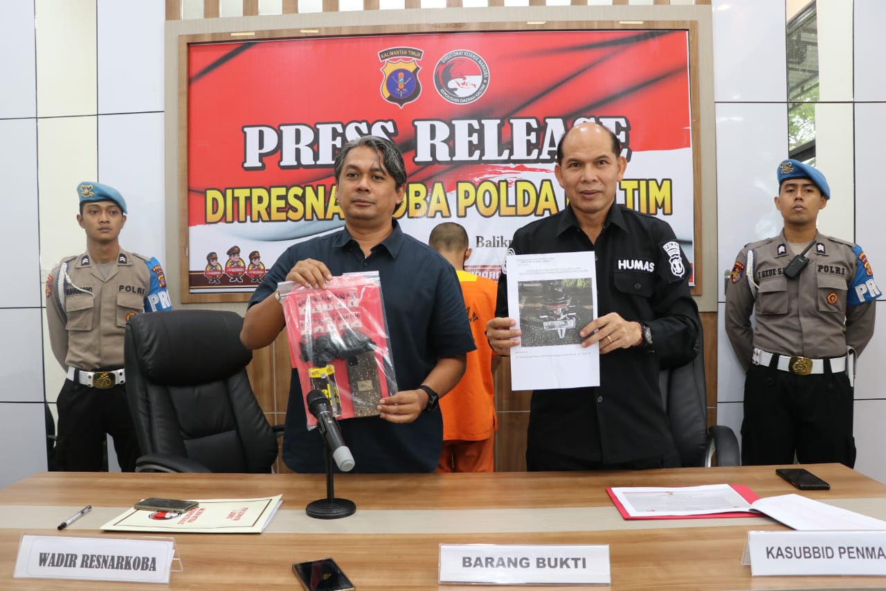 Wadir Resnarkoba Polda Kaltim AKBP Rino Eko, didampingi Kasubbid Penmas Bidhumas AKBP I Nyoman Wijana, menyebutkan, barang bukti sabu seberat 8,99 gram ikut diamankan.