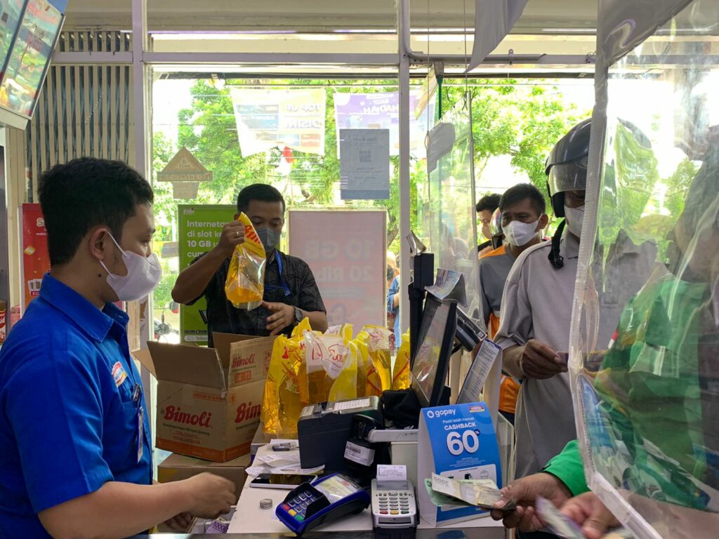 Di retail modern ini warga dibatasi membeli maksimal 2 ribu dengan harga Rp 28 ribu. Mereka yang membeli langsung dilayani di kasir. Saat antrian terjadi, tampak dijaga pol PP agar warga tertib dan bisa menjaga prokes.