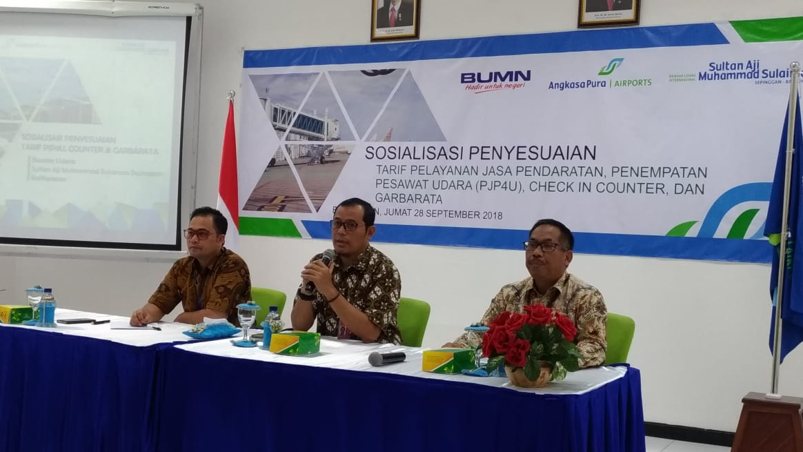 Sosialisasi penyesuaian tarif pelayanan jasa pendaratan, penempatan pesawat udara (PJP4U), check in counter dan garbarata diikuti oleh groundhandling, airlines. Penyampaian sosialisasi dilakukan oleh Iwan Sanusi Libere Sales Departement Head AP I Sepinggan Balikpapan, dan dihadiri Sulkan Vice President Aeronautikal bisnis AP I Pusat. Kegiatan sosialisasi serupa juga dilakukan di Surabaya, Bali dan daerah lain.