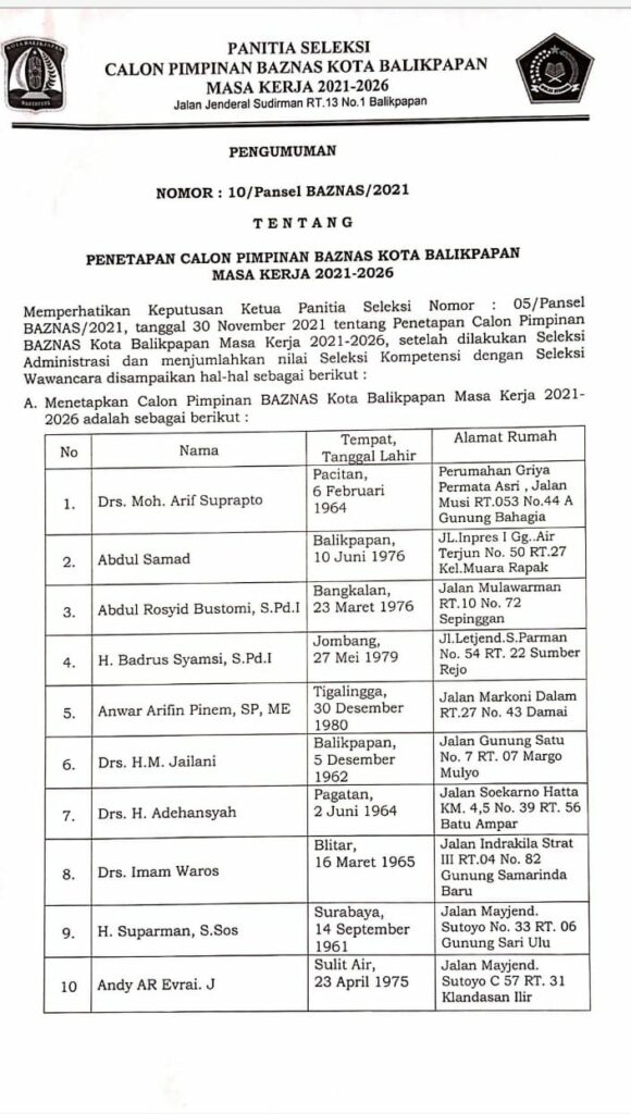 Lalu ditetapkan Pansel melalui surat Nomor 10/Pansel Baznas 2021 tentang Penetapan Calon Pimpinan Baznas Kota Balikpapan Masa Kerja 2012-2026