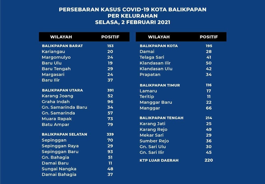 Adapun sebaran per keluarahan tertinggi Graha Indah dengan 96 kasus, Sepinggan Baru 93 kasus, Batu ampar 79, Muara Rapak 73 kasus, Sepinggan 70 kasus, Manggar 66 kasus, Gunung Samarinda 57 kasus dan dan Karangjoang 52 kasus.