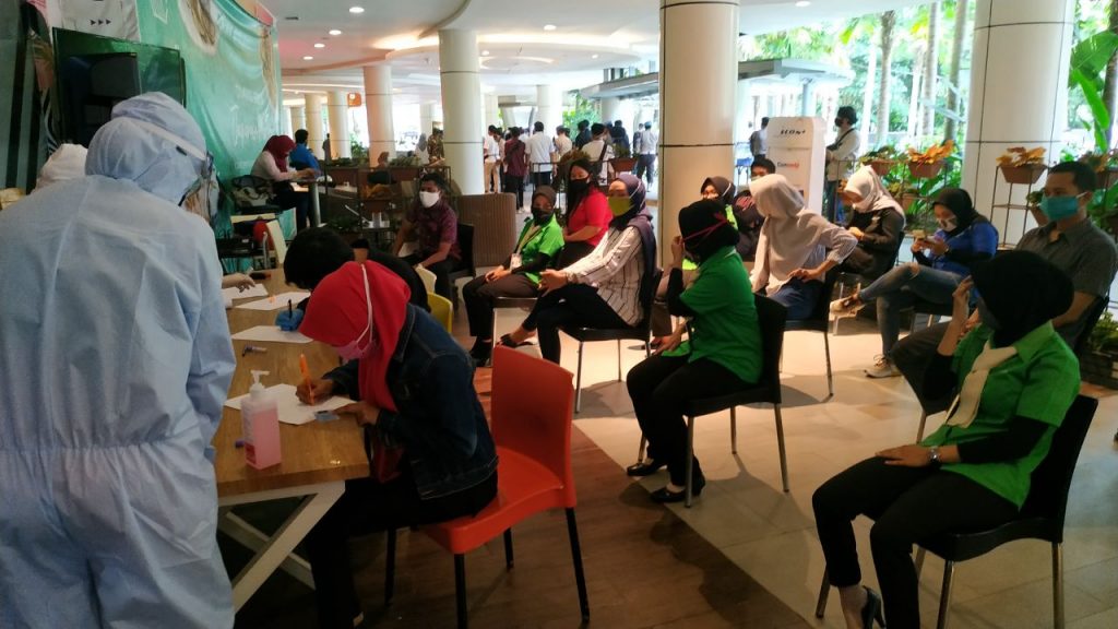 Satu persatu pekerjaa mall ini antri dengan kursi berjarak yang sudah disiapkan. Setelah mengisi data, petugas berpakaian APD yang berada di ruang tertutup melakukan pengambilan sampel darah di bagian lengan peserta rapid test.