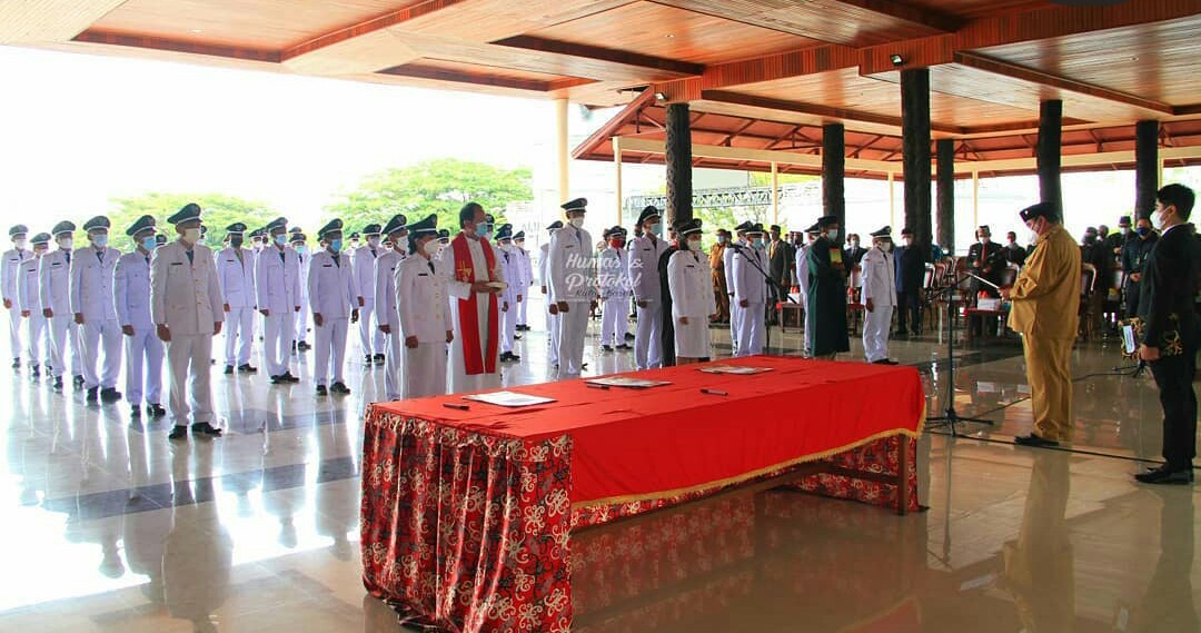 SENDAWAR, Inibalikpapan.com – Bupati Kutai Barat Barat FX Yapan melantik 52 Petinggi atau Kepala Kampung untuk masa jabatan tahun 2021-2025 di Alun-alun Itho Sendawar pada Senin (05/04). Pelantikkan dilaksanakan dengan protocol kesehatan (prokes) secara ketat.