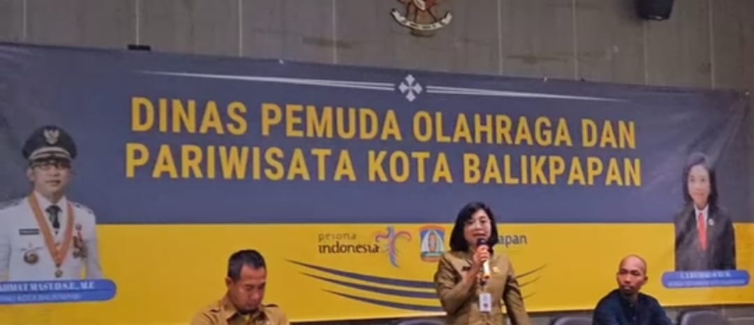 Kepala Dinas Pemuda Olahraga dan Pariwisata Kota Balikpapan, Ratih Kusuma melakukan pelepasan Atlet Sepatu Roda Kota Balikpapan di Aula Disporapar Balikpapan didampingi Pegawai Bidang Olahraga Pak Afrian dan Pak Joko.