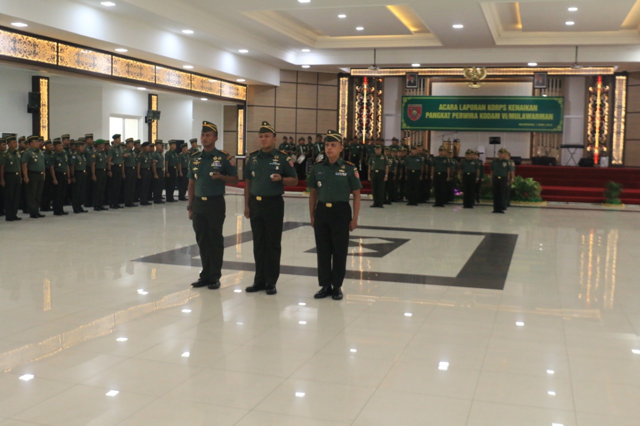 Pada periode 1 April 2019, Prajurit dan Pegawai Negeri Sipil Kodam VI/Mulawarman yang naik pangkat satu tingkat lebih tinggi dari pangkat semula berjumlah 996 orang, terdiri dari Letkol ke Kolonel 7 orang, Mayor ke Letkol 4 orang, Kapten ke Mayor 14 orang, Lettu ke Kapten 15 orang, Letda ke Lettu 6 orang, Letda 1 orang, Bintara 622 orang, Tamtama 255 orang dan Pegawai Negari Sipil 72 orang.