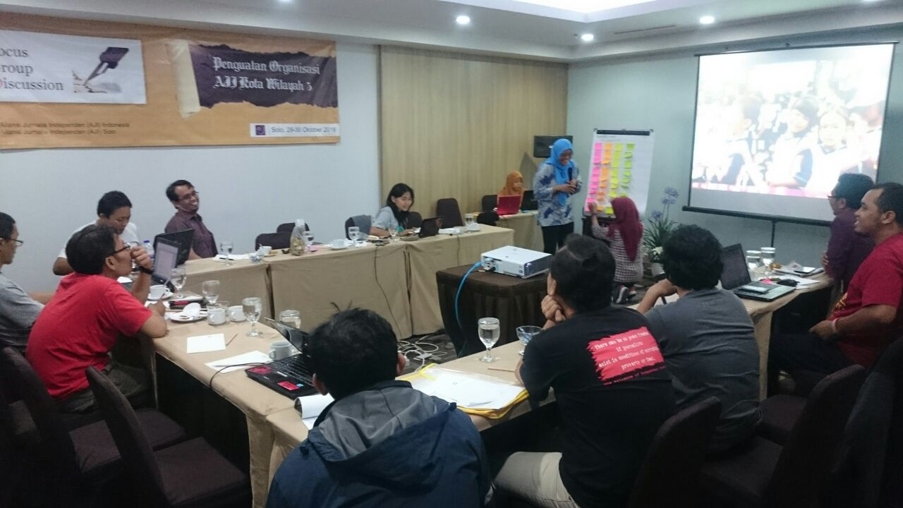 Bertempat di Sala View, Solo, Jawa Tengah, FGD diisi oleh Pengurus Nasional AJI bidang Organisasi Labam Abraham dan Pito Agustin selaku Korwil 3 AJI Indonesia Kegiatan FGD ini diikuti oleh 10 AJI Kota yakni Aji Solo, Semarang, Jogya, Kediri, Malang, Surabaya, Purwokerto, Bojonegoro, Jember, dan Balikpapan.