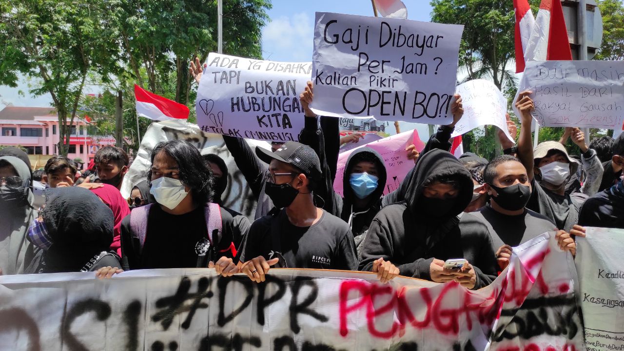 Mereka selain memampang spanduk hitam juga memegang poster-poster bertuliskan penolakan UU Cipta Kerja, termasuk meme yang menyinggung kerja DPRD. Namun juga terlihat bendera merah putih mewarnai kerumunan orang.