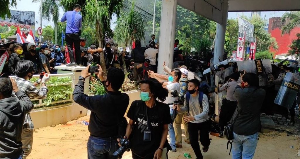 BALIKPAPAN, Inibalikpapan.com — Sekitar pukul 11.28 wita, demo yang mengatasnamakan masyarakat Balikpapan ini tiba di depan gedung DPRD Balikpapan. Terik panas tidak menyurutkan aksi mereka untuk menyuarakan penolakan UU Omnibus Law.
