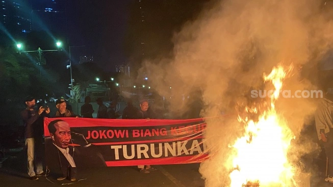 Aksi pembakaran tersebut turut diiringi dengan penampilkan sebuah spanduk yang menggambarkan ketidakpuasan terhadap kepemimpinan Jokowi. Spanduk tersebut menampilkan tulisan tegas, “Jokowi biang kecurangan. Turunkan,” lengkap dengan gambaran wajah Jokowi.