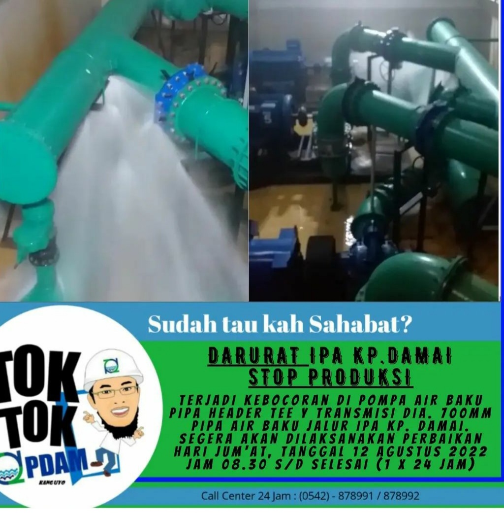 Dengan adanya kerusakan tersebut, PTMB akan segara melaksanakan tindakan perbaikan darurat yang akan dilaksanakan pada hari ini Jum’at, (12/8/2022) mulai pukul 08.30 Wita, estimasi lama waktu pekerjaan kurang lebih 1 x 24 jam, namun diupayakan waktu penyelesaian pekerjaan lebih cepat lebih baik. Berkenaan hal tersebut, maka akan terjadi gangguan pelayanan distribusi air dari IPA Damai atau mengalami Stop Produksi.
