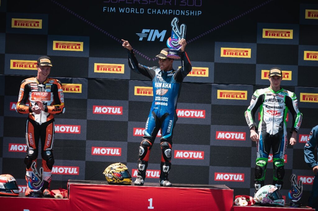 Aldi Satya Mahendra yang menunggangi pacuan YZF-R3. Sebagai produk global yang diproduksi di Yamaha Indonesia Motor Manufacturing (YIMM) berada di posisi ke-2 dalam standing point WorldSSP300.