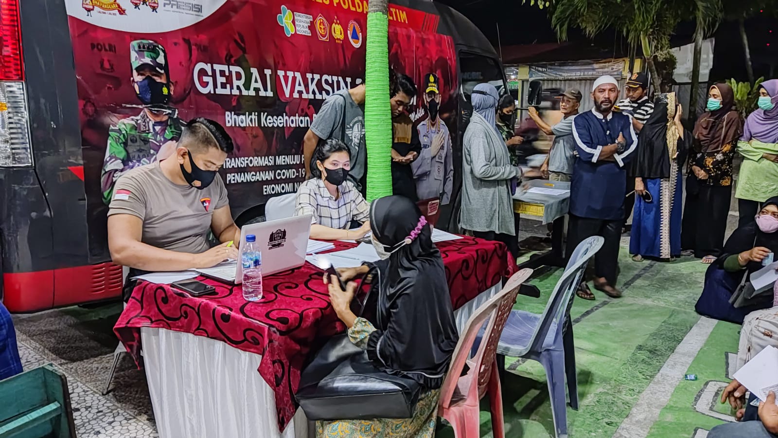 Balikpapan – Masyarakat menyambut gembira akselerasi vaksinasi yang dilakukan pada malam hari oleh Polda Kalimantan Timur di Masjid Al-Falaah, Jl. Indrakila (tiga) Kel. Gunung Samarinda Kota Balikpapan, Selasa (26/4/2022).