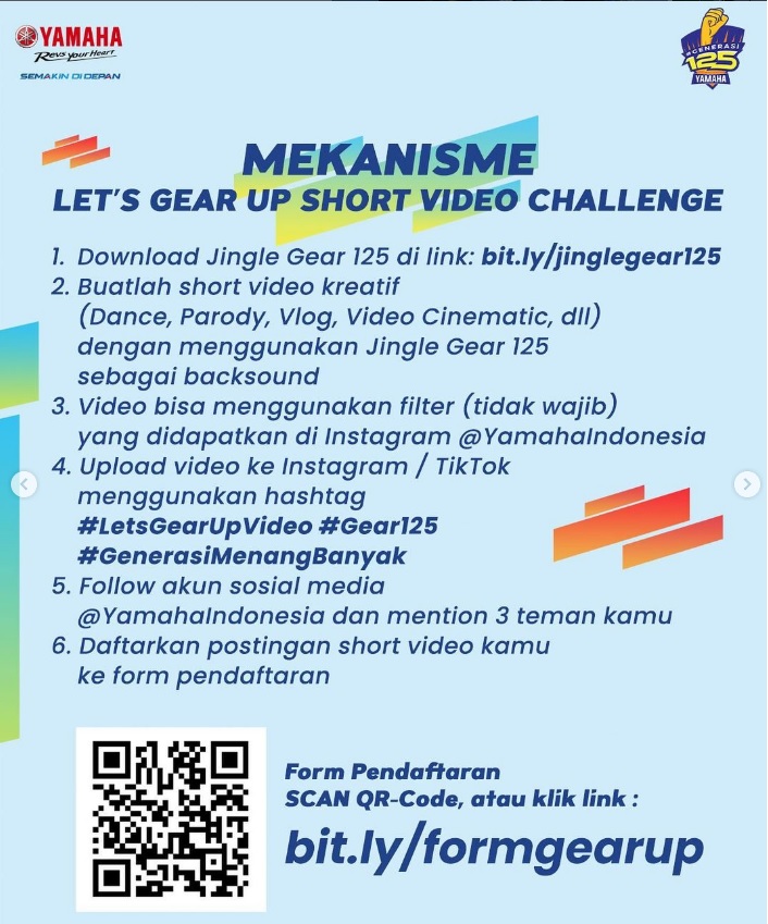 Dengan semangat untuk selalu Let’s Gear Up, Yamaha kembali mengajak para generasi muda yang memiliki kreativitas tinggi untuk mengikuti Let’s Gear Up Short Video Challenge yang masih berlangsung hingga 30 Juni 2023. Video yang paling menarik dan kreatif berkesempatan mendapatkan hadiah seperti 1 Unit Yamaha Gear 125, 2 Unit Smartphone dan jutaan rupiah saldo e-wallet, berikut mekanismenya: