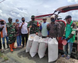Terwujudnya Swasembada Pangan Personil TMMD Ikut Membantu Proses Panen Raya