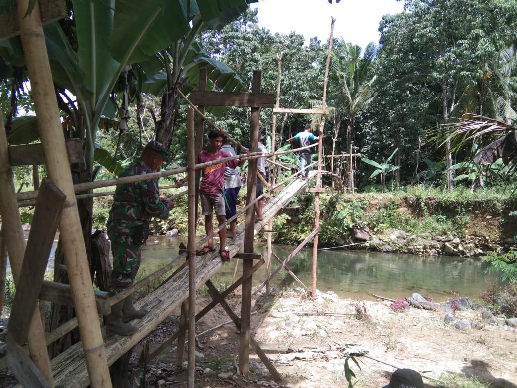 Babinsa Koramil 1002-07/Pagat Sertu Sanu bersama warga masyarakat melaksanakan gotong royong pembuatan jembatan darurat tersebut sehari setelah musibah banjir datang.