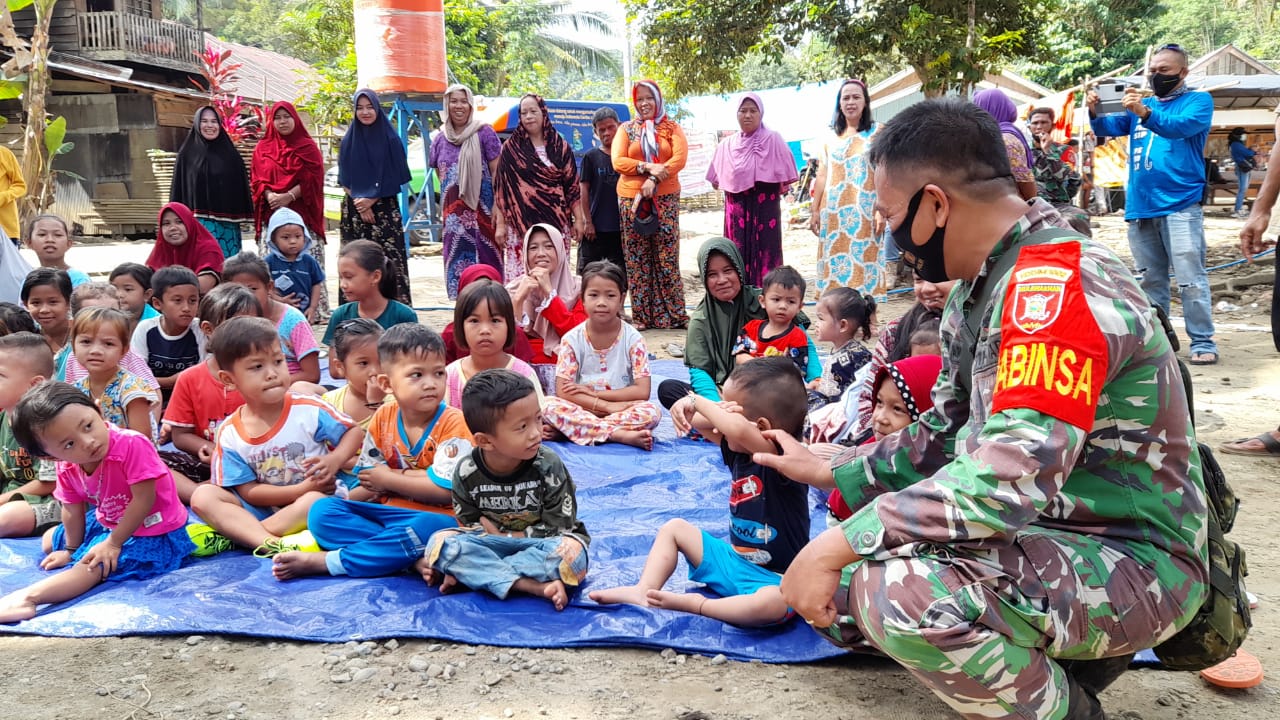 Dalam rangka memulihkan keceriaan dan menghilangkan trauma, Babinsa Koramil 1002-07/Pagat Kodim1002/Barabai Serda Embran Hartono dan Kopka Yusran bersama dinas Perpustakaan dan Kearsipan Provinsi Kalsel menghibur anak-anak korban banjir dan lonngsor di desa Arangani kecamatan Hantakan Kabupaten Hulu Sungai Tengah (HST), Rabu (10/02/2020).