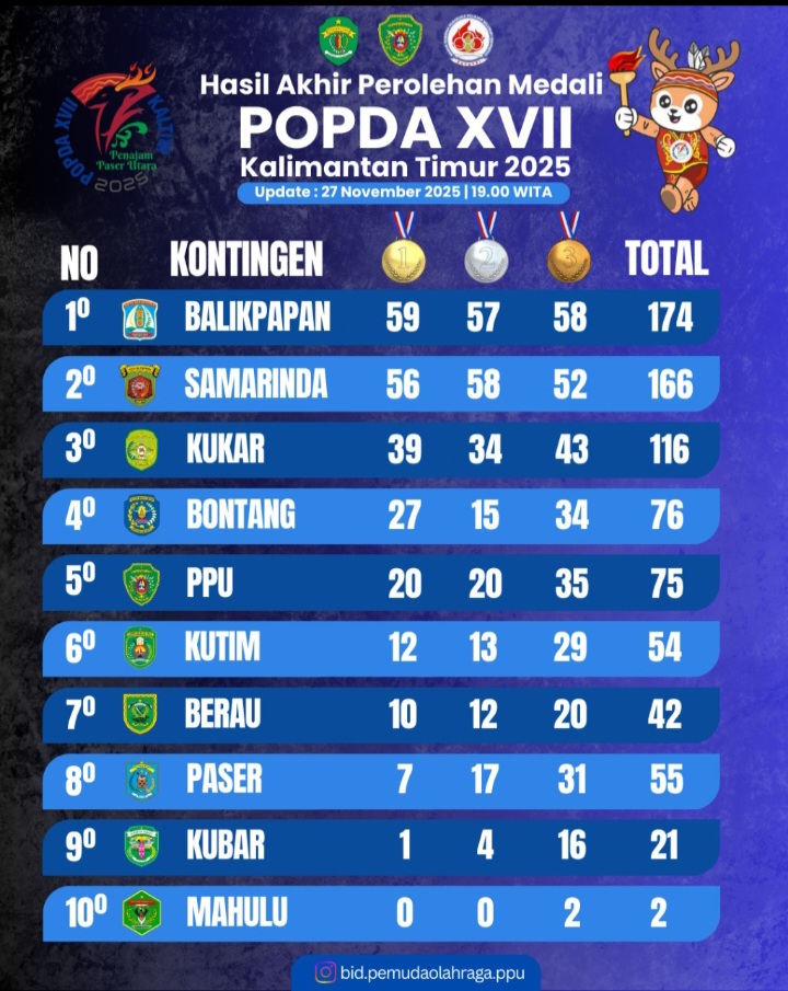 BALIKPAPAN,Inibalikpapan.com – Kontingen Kota Balikpapan kembali menunjukkan dominasinya pada ajang Pekan Olahraga Pelajar Daerah (POPDA) XVII Kalimantan Timur 2025. Berdasarkan hasil akhir yang dirilis pada Kamis, 27 November 2025 pukul 19.00 WITA, Balikpapan berhasil mengamankan posisi pertama dengan total 174 medali, terdiri dari 59 emas, 57 perak, dan 58 perunggu.