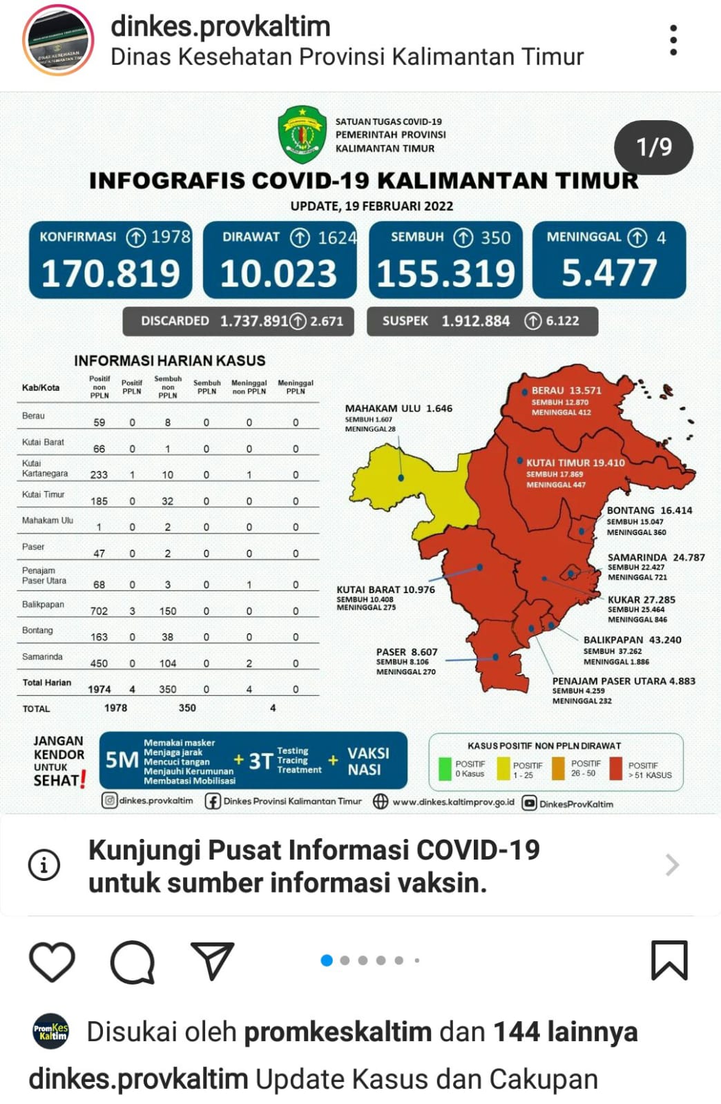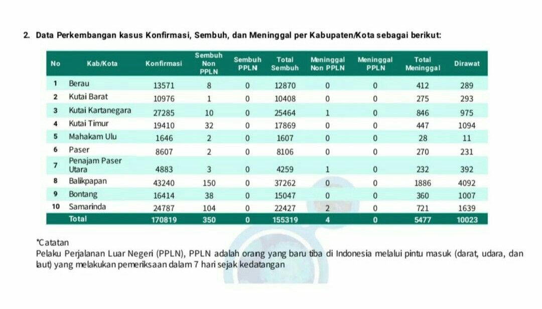 Seluruhnya kasus aktif covid-19 di Kaltim sebanyak 1.0023 kasus.. Untuk kumulatif kasus covid-19 sejak awal pandemi hingga saat ini sebanyak 170.819 kasus.