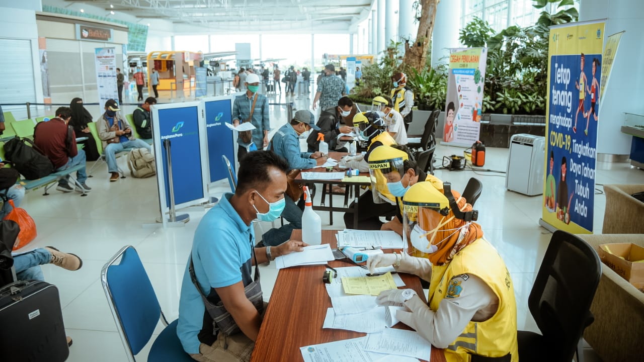Sedangkan yang bertugas, PT. Angkasa Pura I mewajibkan penggunaan alat pelindung diri (APD) mulai dari kacamata pelindung (goggles), masker, sarung tangan serta menyediakan cairan pembersih tangan atau hand sanitizer di area-area terminal.