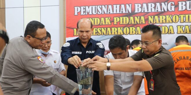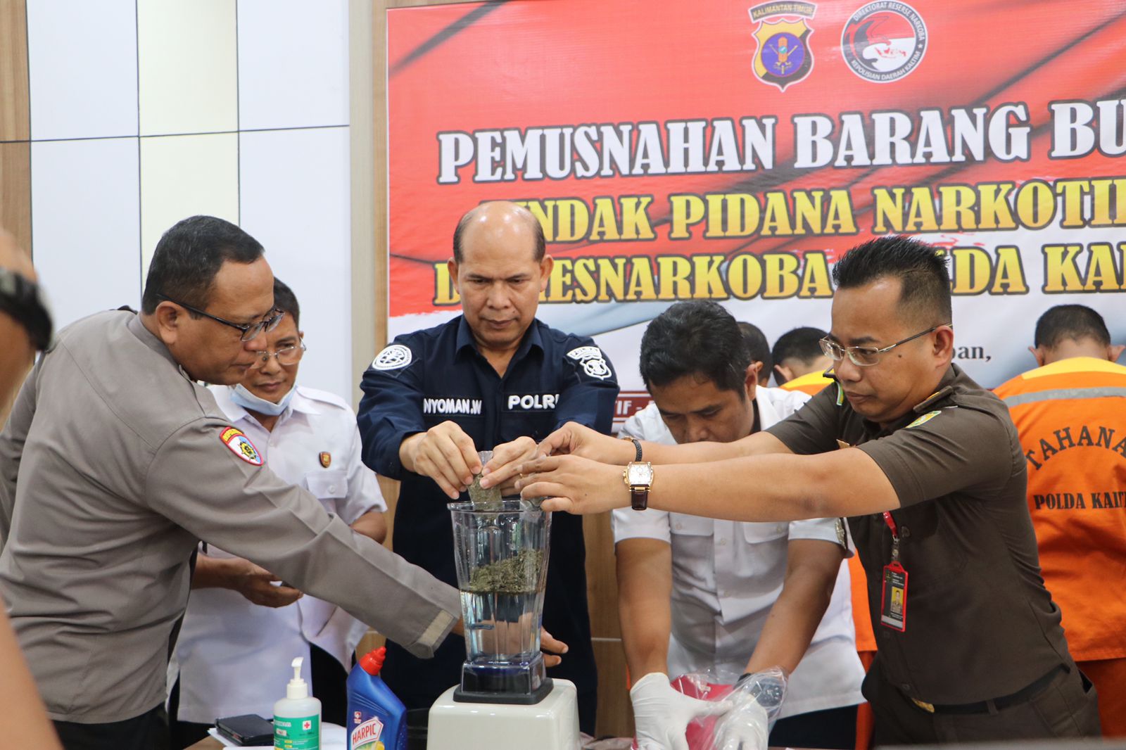 BALIKPAPAN, Inibalikpapan.com – Ditresnarkoba Polda Kaltim musnahkan Narkotika jenis ganja seberat 303,73 gram netto. Pemusnahan dengan cara di blender menggunakan air yang dicampur dengan porstex dan dilarutkan ke dalam kloset, di kantor Polda Kaltim, Rabu (13/9/2023).