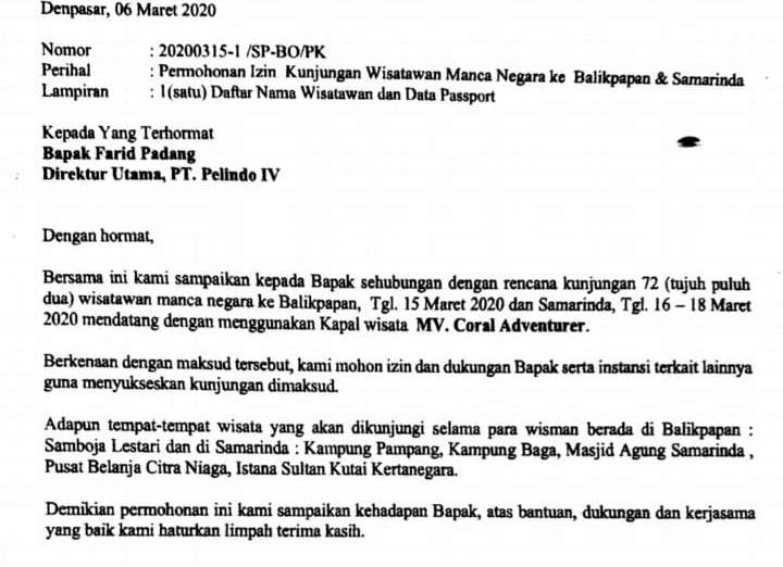 Kapal Pesiar tersebut, melalui PT. Mozaik Wisata Papua telah mengirim surat yang ditujukan kepada Direktur Pelindo IV Farid Padang terkait permohonan ijin kunjungan wisatawan mancanegara ke Kota Balikpapan pada 15 Maret dan Kota Samarinda 16-18 Maret.