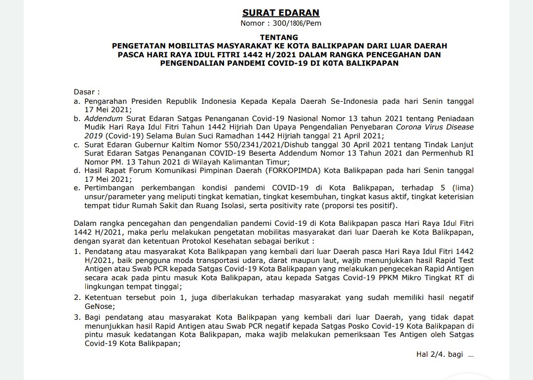 BALIKPAPAN, InibalikpapanPemerintah Kota Balikpapan menerbitkan surat edaran tentang pengetatan mobilitas masyarakat dari luar daerah pasca hari raya Idulfitri dalam rangka pencegahan dan pengendalian pandemi covid-19.