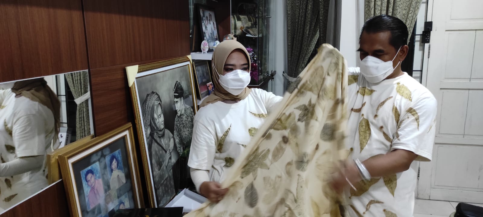 “Saya memilih ecoprint itu karena bahan- bahannya alami, tidak mengandung bahan kimia jadi kita tidak perlu pakai sarang tangan untuk membuatnya, contohnya untuk pewarna alam saya memakai kayu secang, merendamnya dengan bubuk kunyit dan aman jika anak anak mau ikut membantu,” ujar didamping sang suami Muhaimin, kepada media, Minggu (14/11/2021).