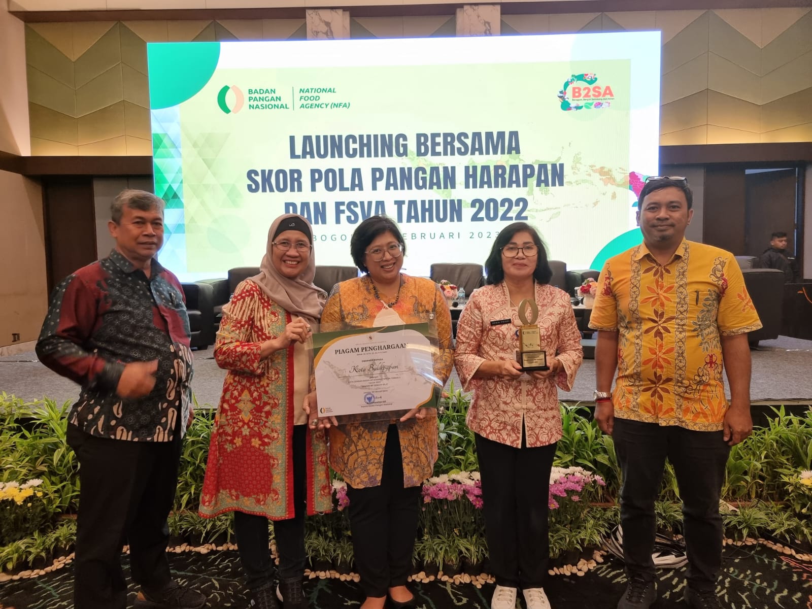 Penyerahan penghargaan diberikan Plt Sekretaris Utama (Sestama) Badan Pangan Nasional Sarwo Edhy kepada Kepala Dinas Pangan Pertanian dan perikanan kota Balikpapan, Sri Wahjuningsih di Kampus Institut Pertanian Bogor (IPB), Selasa (28/2/2023).