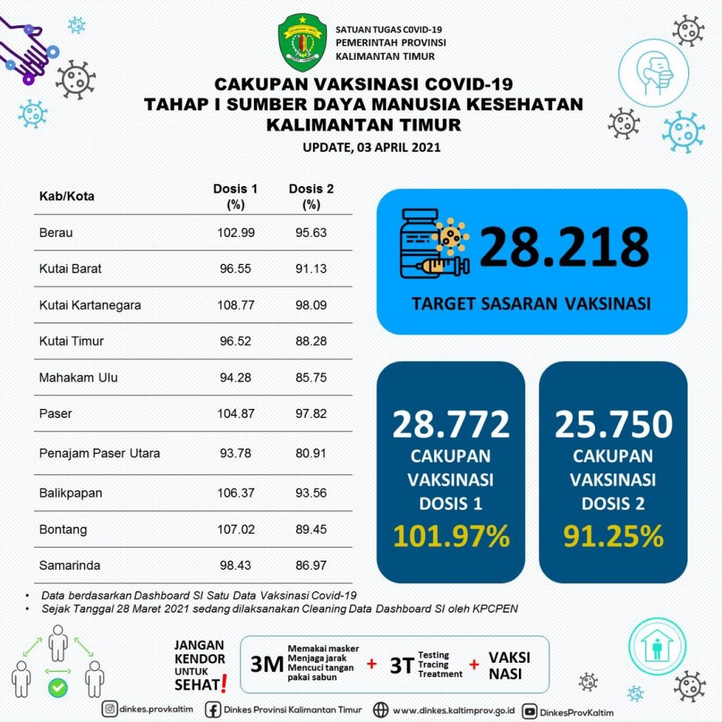 BALIKPAPAN, Inibalikpapan.com – Hingga Sabtu (03/04), cakupan vaksinasi covid-19 di Kaltim tahap I khusus tenaga kesehatan (nakes), dari target sasaran 28.218 orang untuk dosis pertama mencapai 28.772 orang atau 101,97 persen.