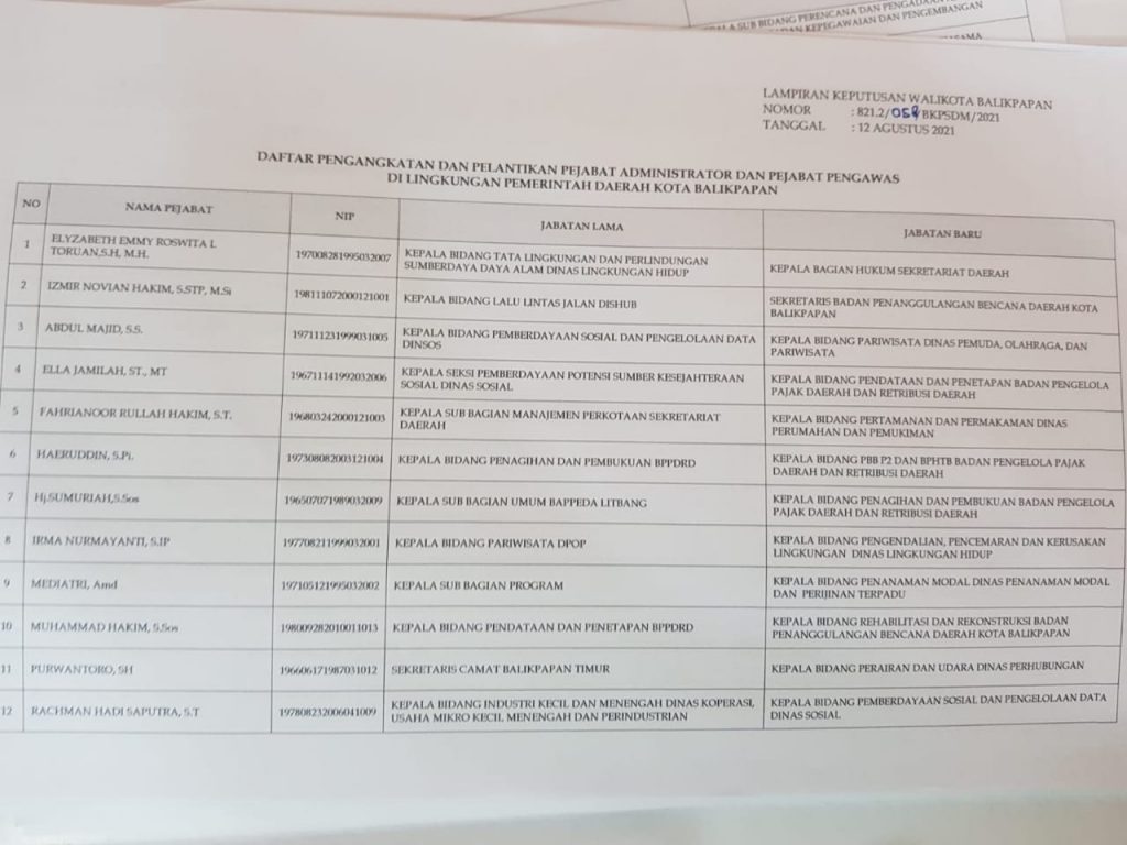 BALIKPAPAN, Inibalikpapan.com – Sebanyak 59 pegawai eselon III dan IV dilingkungan Pemerintah Kota (Pemkot) Balikpapan dimutasi maupun mendapat promosi pada Kamis (12/08/2021).