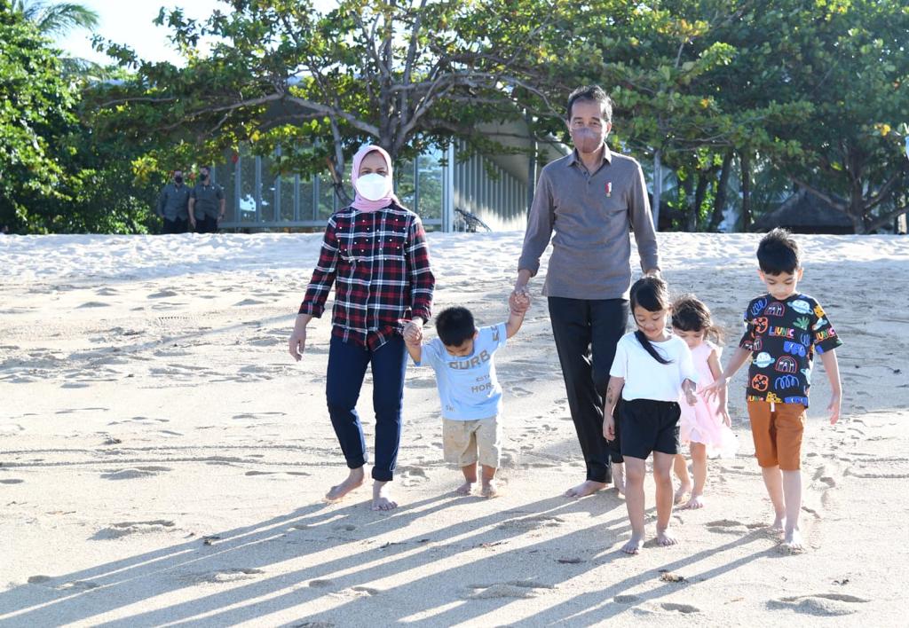 Antusiasme terlihat di wajah keempat cucu Presiden begitu melihat birunya air laut. Setelah melepas sepatu, Presiden Jokowi mengajak cucunya berjalan ke bibir pantai.