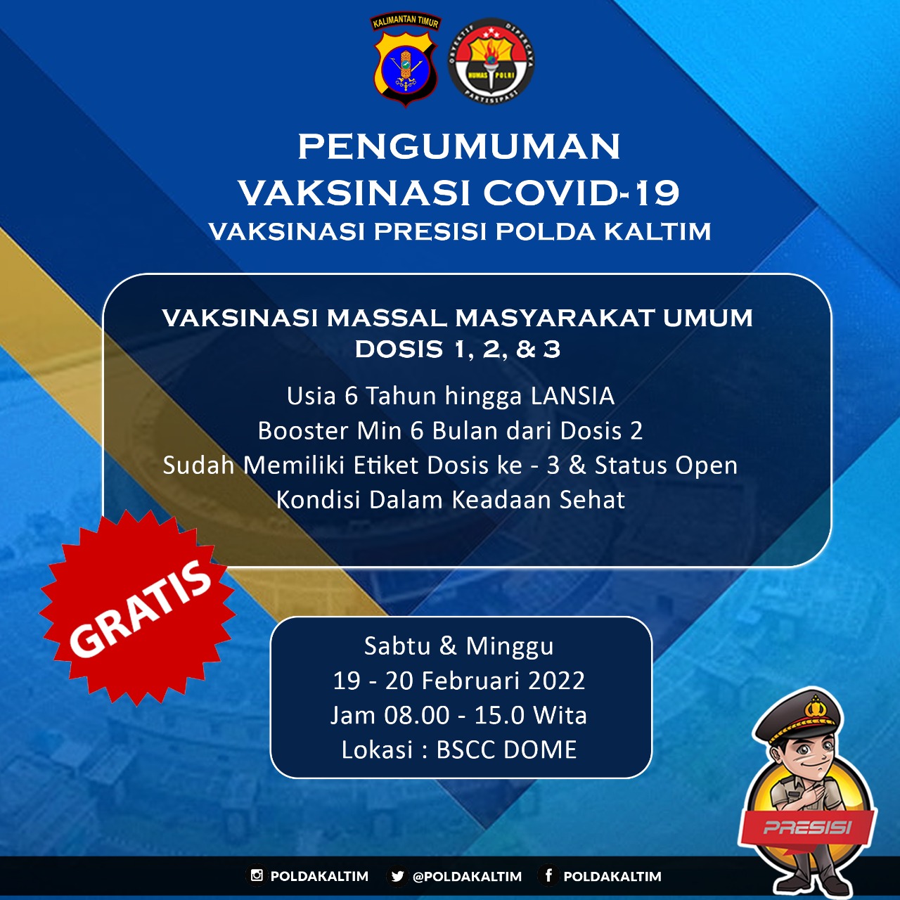 Kabid Humas Polda Kaltim Kombes Pol. Yusuf Sutejo, S.I.K., M.T. mengatakan kegiatan vaksinasi massal tesebut akan berlangsung pada tanggal 19-20 Februari 2022 pukul 08.00 – 15.00 wita di Gedung BSCC Dome Balikpapan.