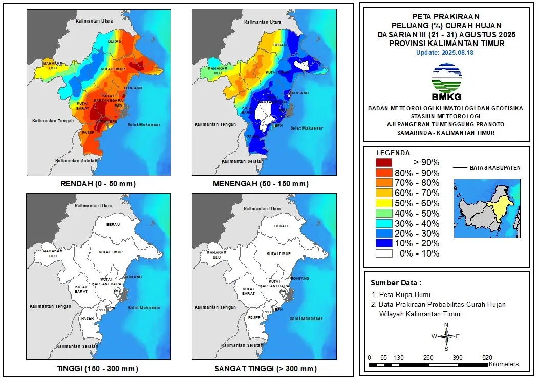“Secara deterministik, wilayah Kaltim bagian timur–selatan cenderung rendah (20–50 mm), sedangkan bagian utara–barat berpotensi hujan kategori menengah (50–100 mm),” ujarnya.