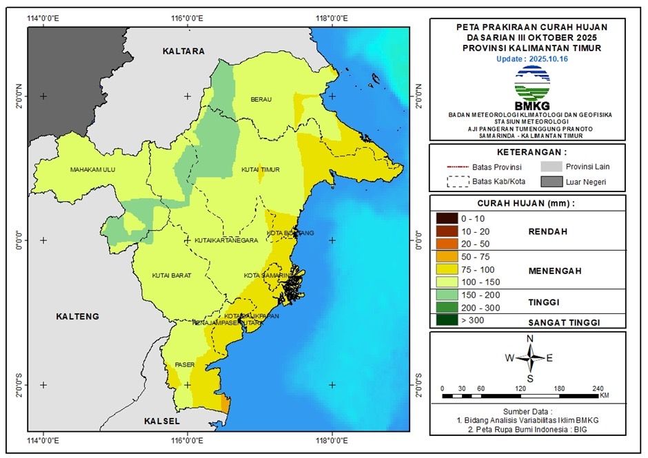 “Sebagian wilayah Kaltim, khususnya bagian barat hingga utara, diprakirakan mengalami curah hujan kategori tinggi (150–200 mm) dengan peluang hujan sebesar 50–60 persen,” terang Riza dalam keterangannya, Rabu (22/10/2025).