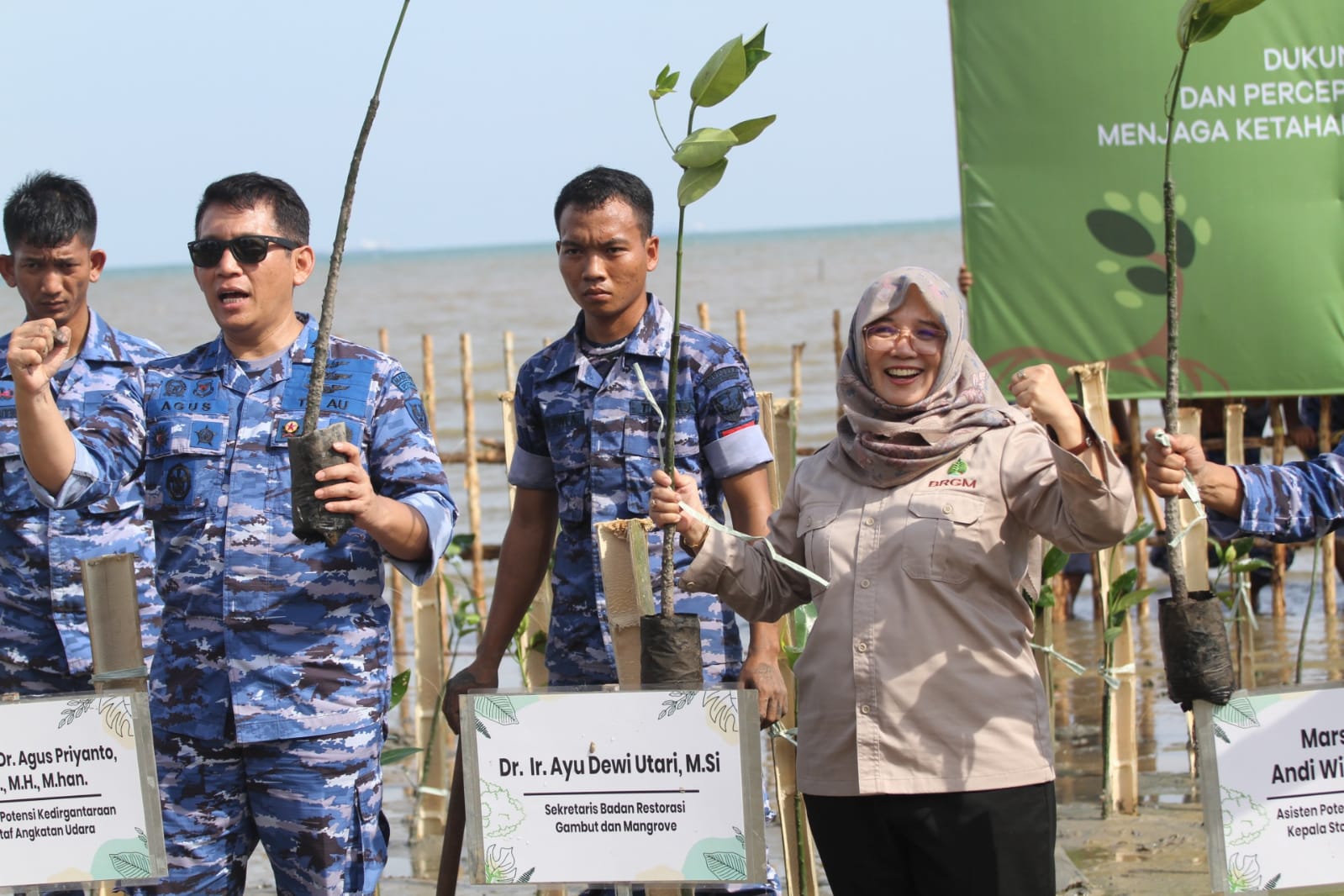 Sekretaris BRGM Ayu Dewi Utari mengatakan upaya bersama untuk restorasi mangrove dan gambut di Kaltim melibatkan pihak lain termasuk TNI rangka menjaga ketahanan wilayah NKRI. Untuk mewujudkan itu, dilakukan penandatangan kerjasama antara BGRM dengan TNI AU di area pesisir pantai Balikpapan sekitar Lanud Dhomber Balikppapan, Santu (2/3/2024).