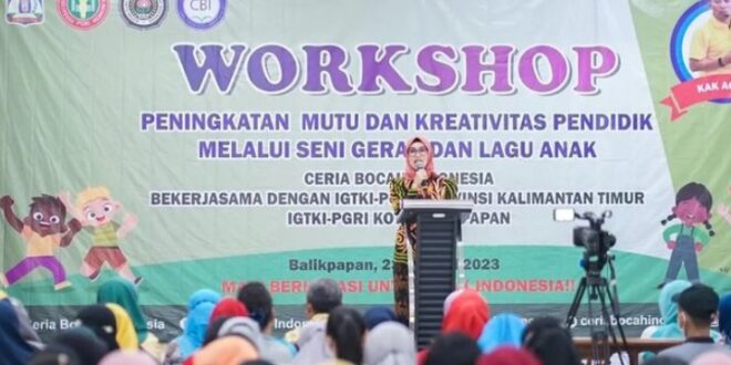 BALIKPAPAN, Inibalikpapan.com – Bunda PAUD Kota Balikpapan, Nurlena Rahmad Mas’ud membuka workshop peningkatan mutu dan kreativitas pendidik melalui seni gerak dan lagu anak, Senin (23/1/2023) di Aula TK Al-Aulia. Workshop ini diisi oleh pemateri dari Ceria Bocah Indonesia (CBI), Kak Agus.