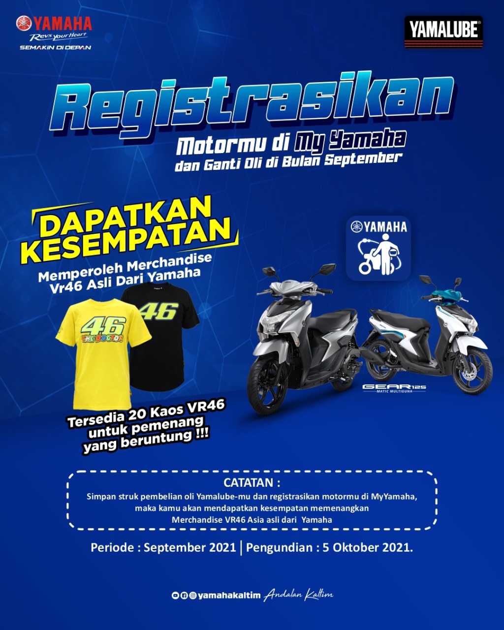 “Bagi kalian yang sudah regitrasi di My Yamaha Motor dan ganti Oli di bulan September ini, dapatkan kesempatan memperoleh merchandise VR46 asli dari Yamaha,” ujar Efendy Ariadi.