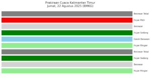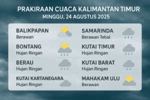 BALIKPAPAN, Inibalikpapan.com – Badan Meteorologi, Klimatologi, dan Geofisika (BMKG) memprakirakan cuaca di Kaltim pada Senin, 25 Agustus 2025, relatif stabil dengan dominasi awan di sebagian besar wilayah. Tidak ada peringatan dini hujan lebat, namun warga diminta tetap waspada terhadap potensi hujan lokal. Pada dini hari hingga pagi (03.00–08.00 WITA), suhu berada di kisaran 23–24°C dengan […]