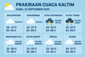 BALIKPAPAN, Inibalikpapan.com – Badan Meteorologi, Klimatologi, dan Geofisika (BMKG) merilis prakiraan cuaca untuk wilayah Kaltim pada Senin, 29 September 2025. BMKG memprediksi sebagian besar wilayah Kaltim akan mengalami cuaca berawan dengan potensi hujan ringan hingga sedang, khususnya pada sore hingga malam hari. Balikpapan diperkirakan mengalami awan sebagian dan badai petir pada pagi dan sore hari, […]