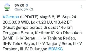 BALIKPAPAN, Inibalikpapan.com – Badan Meteorologi Klimatologi dan Geofisika (BMKG) mengumumkan gempabumi 5.6 Magnitudo menguncang Berau dan dirasakan hingga Kalimantan Utara (Kaltara) Gempa tersebut terjadi sekitar pukul 20.08 Wita, Minggu 15 September 2024. Pusat gempa berada di darat 145 kilometer Tenggara Berau. Gempa dirasakan di Berau Tanjung Redep, Teluk Bayur, Tanjung Selor, Tarakan hingga Bulungan. “Mag:5.6, […]