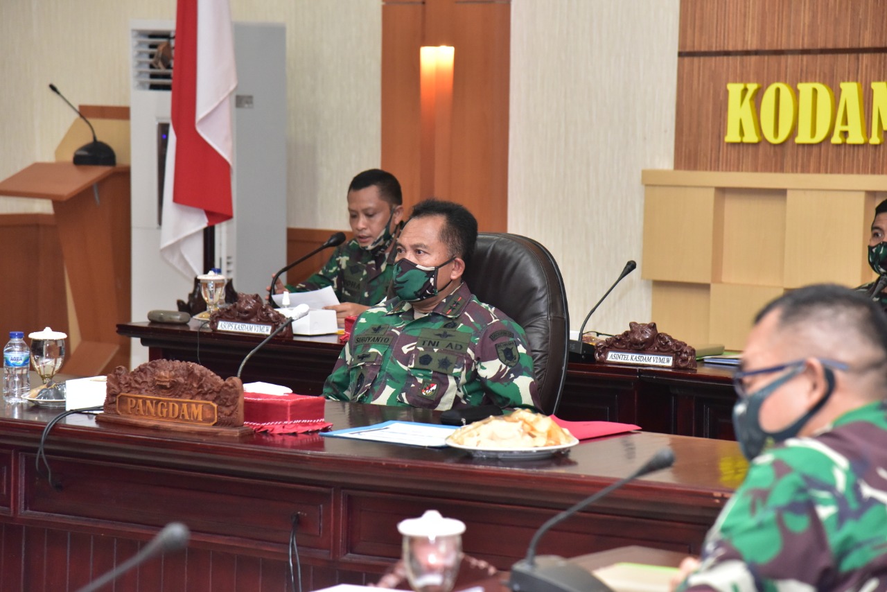 BALIKPAPAN, Inibalikpapan.com – Melalui video conference (Vicon) yang digelar di Ruang Yudha Makodam VI/Mulawarman, Pangdam VI/Mulawarman Mayjen TNI Subiyanto beserta jajarannya membahas upaya pencegahan penyebaran Covid-19 di satuan jajaran Kodam VI/Mulawarman, Selasa (30/6/20).