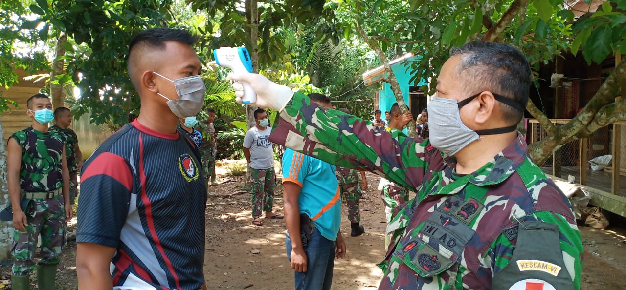 BARABAI, Inibalikpapan – Dalam rangka deteksi dini penyebaran Covid-19, anggota Satgas TMMD ke-107 tahun 2020 Kodim 1002/Barabai melaksanakan pemeriksaan Thermal Scanner (pemeriksaan suhu badan/tubuh), pada Kamis (9/4).