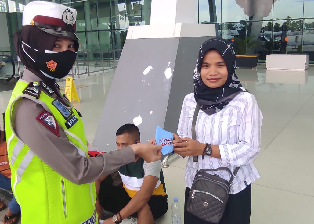 Cegah Penyebaran Covid-19, Polwan Ditlantas Polda Kaltim Bagikan Masker dan Sosialisasikan Prokes