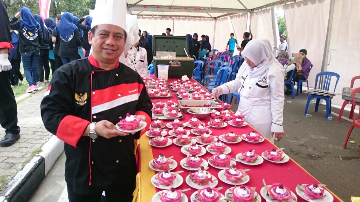 “Buah naga dibelah dua kita kasih fla, cream dan gamisnya kita ambil juga dari daging buah naga. Kita beri taburan coklat. Jadi ini makanan lokal tapi kita sajikan ala internasional,” terang Ketua ACI Balikpapan Supriyadi Hadi (10/2/2016).