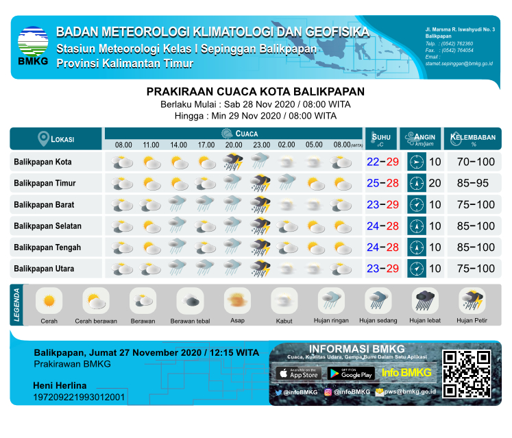 “Diprakirakan ringan hingga lebat disertai angin kencang dan guntur, hampir sebagian besar wilayah Balikpapan,” imbuhnya.