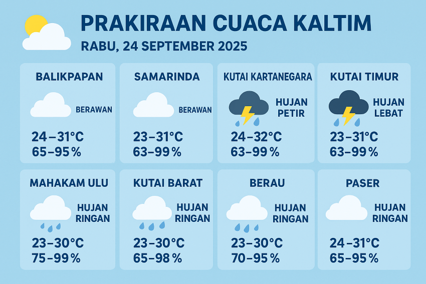BALIKPAPAN, Inibalikpapan.com – Badan Meteorologi, Klimatologi, dan Geofisika (BMKG) merilis prakiraan cuaca Kalimantan Timur (Kaltim) pada Rabu (24/9/2025).